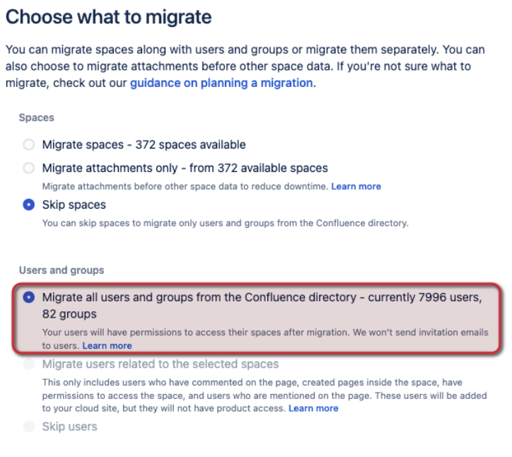 - When you choose what to migrate, select Skip spaces, select None for apps, and Migrate all users and groups from the Confluence directory: