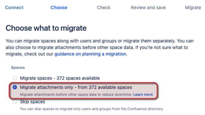 Migrating attachments is typically the longest part of the migration. When you choose what to migrate in the Migration Assistants, you can select Attachments only. This option will only migrate the attachments related to the selected projects or spaces. Breaking your attachment and project/space data migration into different stages has the following benefits: