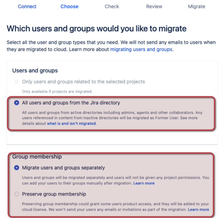 - Preserve group membership – Preserving group membership could grant some users product access, which will be added to your cloud license. We won’t send your users any emails or invitations as part of the migration.